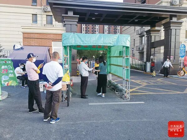 6月15日,在北京市丰台区花乡某小区门口,社区工作人员正按照要求检查居民出入证,并测量体温。中央纪委国家监委网站 喻大伟 摄