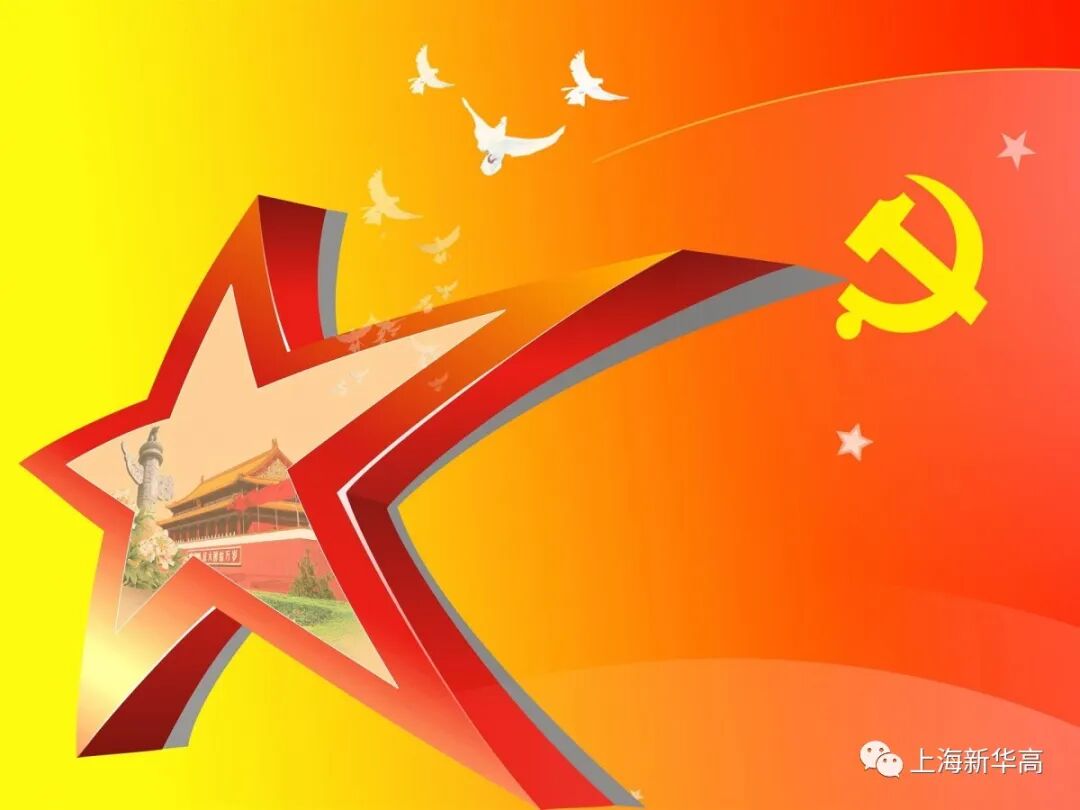 党旗高扬,猎猎作响,世界东方。看先锋队伍,锤镰闪闪,仁人志士,画卷张张。洒血抛颅,英雄虎胆,只把蛇神一扫光。今吾党、期颐零二载,队伍朝阳。