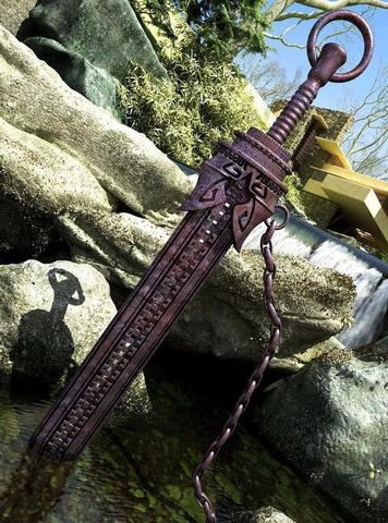 巨阙剑:越五剑中最锋利的一把,刃长三尺有三,柄长七寸,刃宽约五寸,钝而厚重。传说越王勾践曾用此剑一指,便将失控的马车砍为两节,还能轻易将大铜锅刺出缺口。